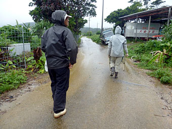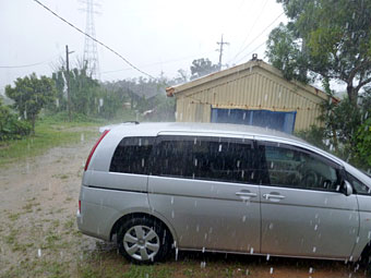 昼食を食べ終わった頃から滝のような雨になってきた。沖縄では梅雨の終わりにはいつも、こうした物凄い豪雨になるんだそうだ。