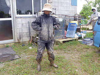 午前中は今までの土砂降りが少しおさまった曇り空の下で、ゴーヤのネット吊り下げ作業。面白いくらいに泥だらけになったので記念撮影。