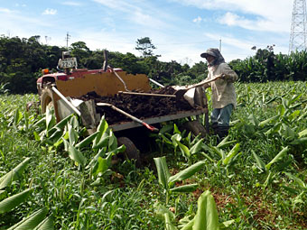 お父さんがトラクターを改造した荷台に積んできた鶏糞を、皆でしゃべるや馬鍬ですくって畑にまく作業は、上腕筋、胸筋など主に上半身にくる。これを続けたら逆三角形の体になりそうな作業だった。