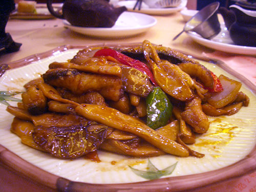 注文した料理2品のうちの一品は乳猪ではなく鰻の方。開いて棒状に切った鰻、エリンギのような食感と旨い味のする平茸のようなキノコ、赤と緑のピーマン、玉葱が入り、オイスターソースかなぁ、いかにも広東という味付けだ。しかし、醤油っぽいベースはうな重の発想に似ている。こってりした鰻に負けない強いソースが絶品の相性できのことの取り合わせも嫌味がなくって美味。