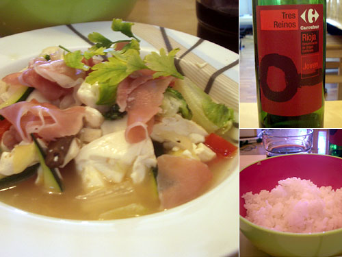献立:豆腐と野菜のうま煮、ご飯、赤ワイン