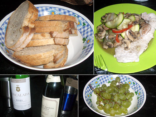 豚肉のソテーと野菜炒めに合わせてカルフールでバゲットでも買おうかと思っていたら、試食品が出ていたカンパーニュがおいしくてつい買ってしまった。カリッとした外側と湿ったようにむっちりと詰まった内側のコントラストのあるパンで野菜炒めの汁に浸しても旨い。ワインはスペインのリオハの余りと地元のコート・ド・ローヌ。スペインの土の香りに対してフランスは華やかな感じのワイン。デザートに旬のブドウ。