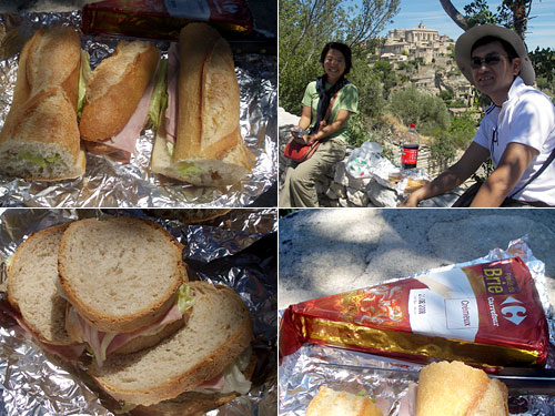 リュベロン地方を巡るドライブはゴルドという丘の上にモンブランケーキのように作られた村が見られるビューポイントでお昼ご飯となった。私たち以外にも数組がここでお弁当。特に駐車場があるわけでもなくベンチもないが、無料で路上駐車して路肩がいいベンチがわりになった。バゲットとカンパーニュのサンドはハム、レタス。カルフールのブリーは安いのでやや味が薄めだが悪くない。好みでブリーを切ってはさんだ。