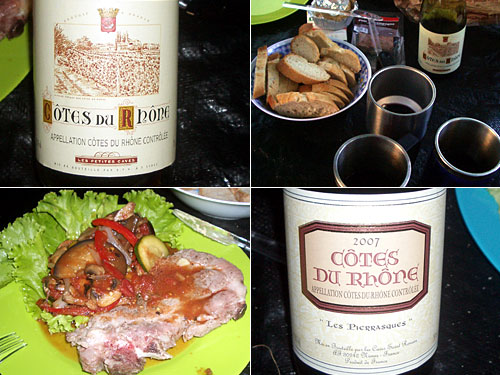 アヴィニヨンから北部のローヌ川沿いはワインの名産地。ここでコート・ド・ローヌのワインを楽しまなくってどーする!と2種類を購入。1つはカルフールご推薦(右下)、もう一つはもっと安いもの(左上)。たった1ユーロくらいの差なんだけど、断然カルフールご推薦の方が香りも味もいい。フルーティーな香りを楽しんだ後、口に含むとふくよかなブドウの味。スパイシーさはなくてタンニンも強くないので飲みやすい。
