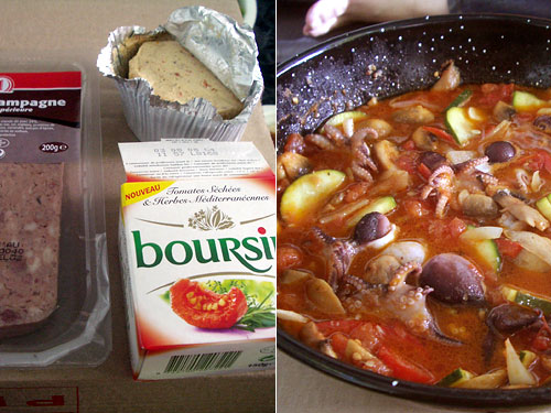 昼のメインは小タコと野菜のトマト煮こみといわしのソテー。メインができるまでパテ・ド・カンパーニュとブルサンをバゲットに乗っけて白ワインで前菜。にんにくの効いたパテはマッタリとした味わいで内臓系の嫌いな夫も受け付けられるおいしさ。カルフールのナンバーワン、つまり一番安い商品だけどいける。ブルサンは新商品のトマト入り。これはまぁまぁかな。