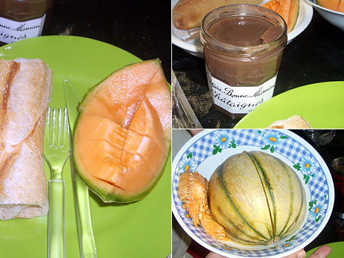 献立:バゲット、メロン、栗ペースト、ヌテラ、牛乳、コーヒー、紅茶