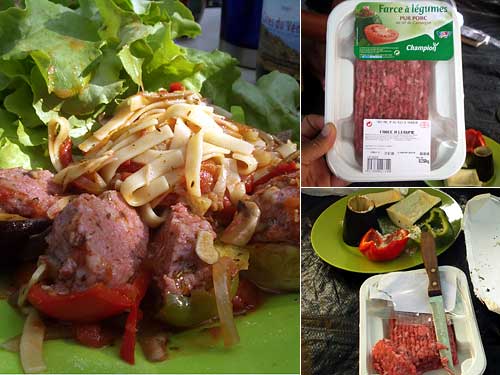 ここの所マルシェのお惣菜でファルシをよくみかけて作ってみたいなぁとスーパーにいったら「野菜のファルシ用ひき肉」ってのが売っている。さすがプロヴァンス。これをくり貫いたナスとズッキーニとピーマンにちょいちょいと詰めてトマトソースで煮込んで出来上がり。ついでにパスタも入れて添えた。片栗粉が入ったようなプリプリした食感で既製品的だがハーブがきいて味はいい。