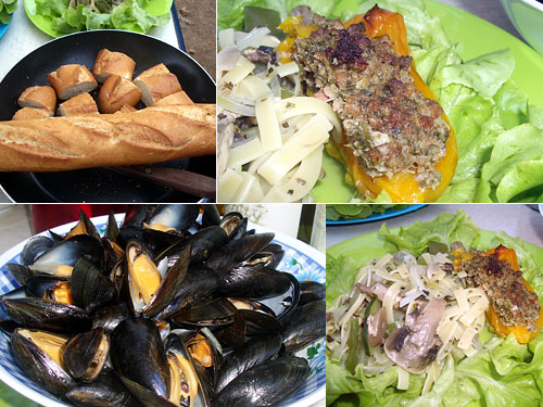 献立:ムール貝の白ワイン蒸し、野菜のファルシ、パスタ、レタス、バゲット、白ワイン