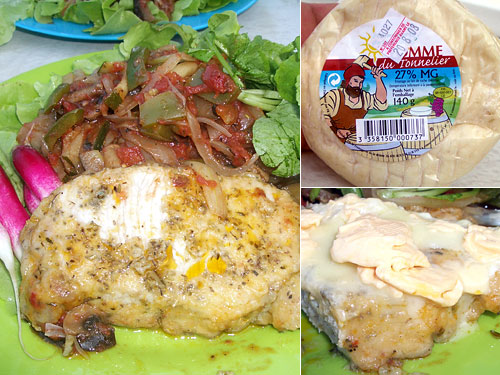 昼間買ったチーズは日中のテント内の気温が高まって夕方にはトロリとした状態になっていた。デザートにと思っていたが豚肉のソテーの上に置くと熱で更にとけてソースのようになった。これって、コルドンブルーじゃないか。淡白な豚肉がこれで濃厚な風味になりチーズの特有の味も加わって複雑な旨さになった。このチーズ、名前がわからない。「樽屋のナントカ」というらしいが。