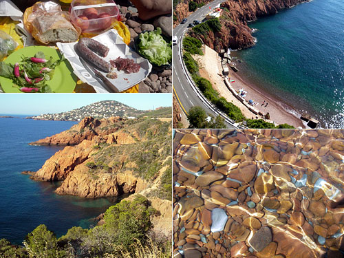 コルニッシュ・ド・レステレルという面白い地形の海岸沿いドライブと、途中のラ・トライヤから裏山に登るトレッキングを計画。しかしラ・トライヤでは夏は山火事の危険性があるので山を閉じていてできなかったので、急遽、眼下に見える入り江で泳ぐことになった。赤く見えるのは石が赤いから。所々に水色の石があってとても美しい。昼食はモモが傷みそうで持ってきたのが正解。ビーチでモモは結構いける。