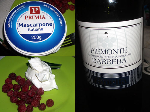 せっかくイタリアに入ったのだからデザートもイタリアンにしようとティラミスに使うマスカルポーネチーズを購入。フランボワーズの横に添えて砂糖をふっただけだが濃厚な生クリームみたいで相当においしい。250gも一気に食べられるか?と思ったが食べてしまった。濃厚なんだけどさっぱりしているのだ。イタリアワインは1.5リットル入りも普通に売られている。安いけどふくよかで旨い。