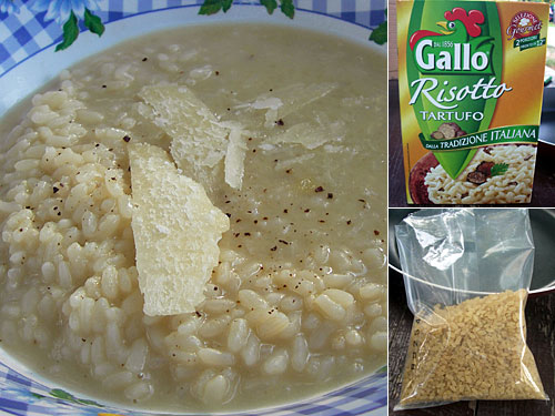イタリアのスーパーに行くと日本のインスタントラーメン並みに種類豊富なインスタントリゾットが2人前入りで2ユーロ程。今朝は第一発目としてトリュフのリゾットだ。水を加えて中火でかきまぜて12分。トリュフの香り高いリゾットがふっくらとできあがるではないか。パルミジャーノもこの際削るんじゃなくて薄切りを乗せる。生クリーム仕上げなので朝から濃厚な食事だ。これ、簡単でおいしくてお土産に最適なんじゃないだろうか。