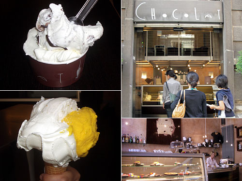 ミラノ在住日本人から教えてもらった2つの人気ジェラードのお店の1つ。「最後の晩餐」のある教会と地下鉄Cadorna駅を結ぶボッカッチオ通り沿い、駅に向かって右手にあるショコラという店はチョコレート屋なのだがジェラードもおいしいと評判らしい。朝11時には全種類が出揃うそうだがチョコジェラード以外のフルーツ系も盛がよくて味も絞りたてジュースのようでおいしかった。もちろんチョコレートもありデザイングッズも販売。