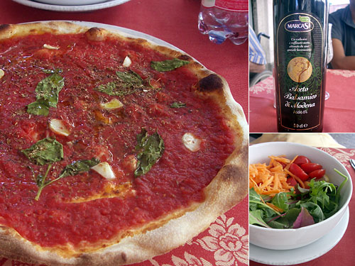 ピザ1枚、サラダと水という注文にしたのだが、ピザは生地にトマトソースとにんにくとバジルを載せて焼いただけというシンプルなもの。マルゲリータもシンプルだと思っていたけど、そこから更にチーズをマイナスしちゃってるんだから。しかしこれが単純においしい。生地が、トマトが、バジルが、個々の味が引き立っていた。サラダも人参とトマトとルッコラがバサッと器に入っていてバルサミコをかけて食べる。これ、アルゼンチンと同じだ。