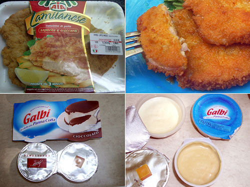 これもよくスーパーで見る定番のインスタントで油で揚げるだけになっているミラネーゼ。キャンプ場なので完全に揚げるほど油を使うのは難しく多めの油で半分浸かる程度で調理するので油切れが悪い仕上がりなのが難点。ただし塩味もちゃんとして味はいい。なによりお手軽なのが嬉しい。デザートにはキャラメルと生クリームの2種のムース。かなり柔らかくトローッとしていておいしい。この手の商品が多い。