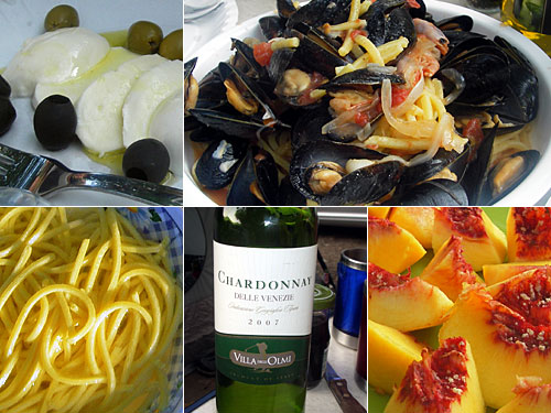 献立:モツァレラとオリーブ、ムール貝と海老のパスタ、白ワイン、モモ