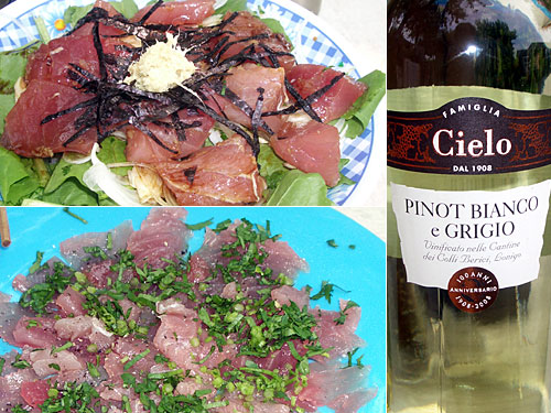 ガルダ湖はイタリア人に人気のリゾート地。バカンス気分のイタリア人をあてこんでかスーパーには豊富な魚介類が並んでいた。イタリア人の客と店員の「このマグロ、カルパッチョできるかい?」「できるよ!」という会話を聞いて私たちも購入。マグロはカルパッチョよりも醤油につけてご飯に乗せて食べる方が断然旨かった。ワインはピノブランとピノグリ混合。ピリッとするピノグリの刺激が少しだけ感じられた。