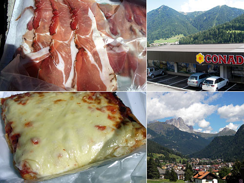 ドロミテ西側ルート1日ドライブの途中、CONADというイタリアには珍しくチェーン展開しているスーパーを発見し、スペック150g(2.49ユーロ)とピザ1切れ(1.58ユーロ)でお昼ご飯。スーパーの駐車場の縁石でぱくついた。スペックはチロル地方の特産の生ハム。パルマと比べても遜色ないツヤと甘味のある旨みがあった。ピザは店内で温めてもらったのでモツァレラも熱々。生地はやや厚めだが外側がさっくりしてフワフワした食感が旨かった。