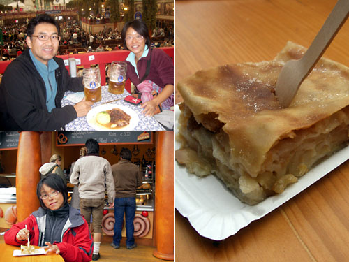 会場では1リットルジョッキしかサイズがないが種類は選べる。私たちはヘルHellという軽い黄金色のビールを注文。これがおいしくてグイグイ飲める。会場の熱気で体が火照り喉が渇いて更にグビグビ。ついに飲みきってしまった。デザートは外の屋台でシュトゥルーデル。薄い生地にアップルのシナモン煮が入ったドイツ・オーストリア名物のお菓子だ。そんなに甘くなくておいしいのだ。いやー、完全酔っ払い。