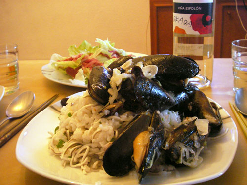 フライパンに油を熱してニンニクと葱のスライスを放り込み、香りがついたらムール貝と白ワインを入れて蓋をする。ムール貝が口を開けたら鍋にたまっただし汁と鰻の稚魚をご飯に混ぜる。ご飯とムール貝を盛る。っていうムール貝丼を作ってみた。鰻の稚魚はさっぱりしているようで食べ続けると鰻のコクが強いし、ムール貝も味が濃いので逃げ場がほしい。逃げ場のない丼でしつこいことになってしまったが夫には好評だった。