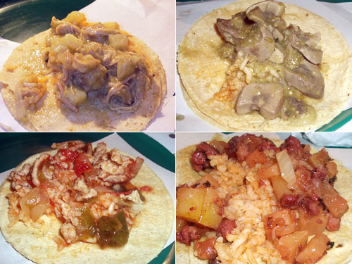 ジャガイモと鶏肉の煮込みもなかなか素直な味わい。ここまで食べるとちょっと冒険したくなって内臓系に挑戦してみる。どこの部位かわからないけど指差しで注文。うーむ。臭い。内臓臭い。緑の辛いソースを思いっきりかけると臭みが大分消えた。夫は順調にひき肉とトマト、肉じゃが風をこなしてフィニッシュ。各タコスはトルティーヤ2枚にライスが敷いてある。手のひらサイズとはいえこれだけとうもろこしと米をつめこむとお腹一杯になる。