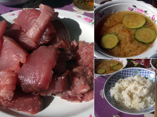 献立:マグロの刺身、ご飯、味噌汁