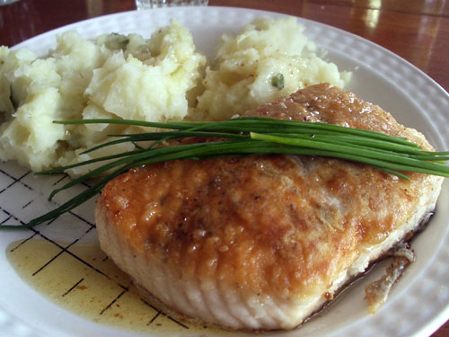 サーモンを冷蔵庫で解凍してから塩、胡椒して小麦粉を振る。フライパンにニンニクと油を入れて熱し、香りが出た所でサーモンを入れてフタをする。焼き目が付いたら裏返して焼き目を付けてあとは弱火で焼く。付け合せはマッシュポテト。キャンプに持っていく乾燥タイプを試験的に買って使ってみた。チリのサーモンは脂がのってジューシーでフワフワとしている身。シブレットを添えると見たも味もぐんとアップした。