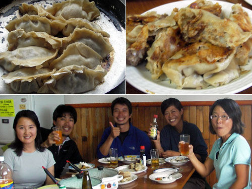 人におねだりしたメニューにもかかわらず友達まで勝手に招いて餃子パーティー。手間のかかった餃子の皮は今まで旅先で頂いた手作りの皮の中では群を抜いておいしかった。そうか、おいしいものには時間がかかるのだ。ここの宿はガスコンロではなくチリの伝統のガス暖房機を兼ねたもので火の調節が難しい。焼いた皮がフライパンからはがれなくて苦労した。で乾杯。左から青木夫妻、石原夫妻、そして私。楽しい夜となった。