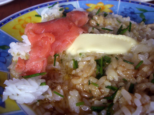 その細い葱のようなシブレットだが辛味はなく薄くにんにくのような独特の旨味がある。この味が魚介類の生臭さを押さえて旨味を引き出していると思われる。熱々の炊きたてご飯に半熟状態になった卵、バターのコク、そしてスモークサーモン。もうあーだこーだ言う必要もなく日本人なら誰にでもわかる確実な旨さだろう。幸い誰にも見られる事なく卵かけご飯を終了したが白人が見たらギョッとすることだろうな。