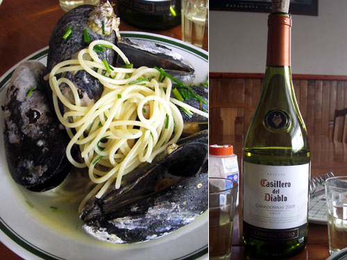 サラダ油を熱してニンニクと玉葱のみじん切りで香りを出してムール貝と白ワインを加えてフタをする。貝が開いたら茹で上げた麺とシブレットを入れて少しあおってできあがり。大きなムール貝からは驚くほどのおいしい汁が出てきて麺に旨味を与える。ふっくらとした貝は甘みがあってあんなに汁を出しても尚ジューシーさを保っていた。ワインはコンチャ・イ・トロのカシエロ・デル・ディアブロ。ご機嫌なランチとなった。