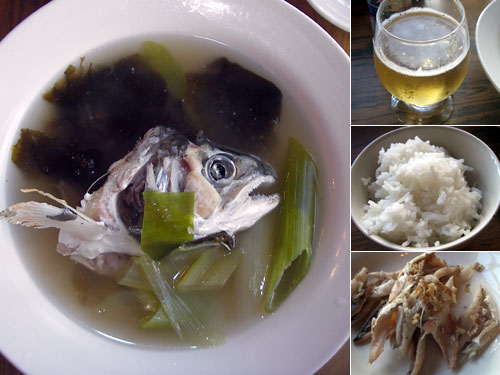 川魚の頭をそのまま煮ると生臭くなると思ったので、葱と頭をニンニクの香りを付けてフライパンでよく炒めてから水を入れて煮込む。煮えると頭がプカプカ浮いてくるのを合図に火を止めてざるで具をこしてスープだけにして、最後にワカメを加えて塩・胡椒で味を調えてできあがり。盛る時に頭も入れた。淡くてやさしい味のスープとワカメの海の香りがマッチしておいしかった。ハラミは文句なしに美味。