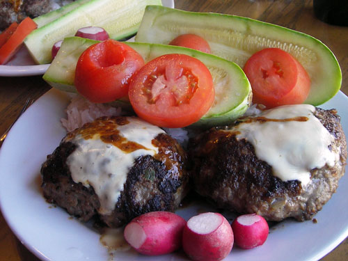 献立:チーズハンバーグ、塩茹でズッキー二、トマト、二十日大根、ご飯