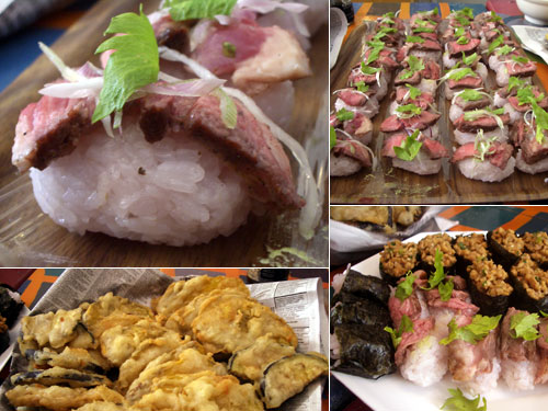 今回2回目となるローストビーフ寿司。酢飯の酢の配合を米1kgに対してリンゴ酢酢200cc砂糖200ccにしたのだがこれが甘すぎた。砂糖は半分でも良かっただろう。更に握りが大きいと肉の味が消える。もっと小さな握りで良かったようだ。供出してもらった納豆と海苔で作った納豆軍艦巻きは文句なしに旨かった。天ぷらもBlancflor(膨らし粉入り小麦粉)を使ったのでパリッとして成功。旨い楽しいランチだった。