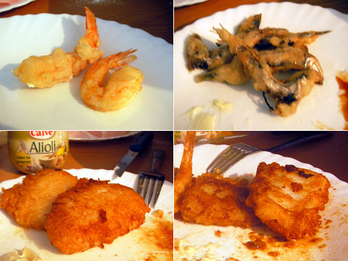 今日のネタは海老、きびなごに似た小魚、白身魚の切り身、イカ。スペインはイカも種類が豊富で色々あるが今日は一番安い巨大イカの切り身で3cmの角柱のような大きさで売っているやつだ。天ぷら粉としてベーキングパウダーは入っている小麦粉を使ったので簡単にさっくりと仕上がるのはアルゼンチンで学んだ術。イカは水っぽくて今一つだったが他のネタは思った通りにおいしかった。揚げてすぐ食べる贅沢。