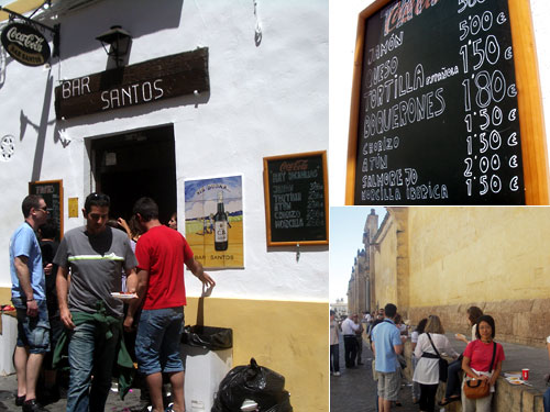 コルドバの最大の観光スポットであるメスキータから出て左に歩いて行くと行列の店BAR SANTOSが目に入る。ロンプラでも紹介されているこの店の自慢はトルティージャだそうだ。カウンターだけの狭い店内は3人で満席。だから皆、店の外のメスキータの外壁縁に座って食べることになる。世界遺産でトルティージャ。これコルドバで最高の組み合わせ。ついでにコルドバ名物サルモレッホSalmorejoも注文。