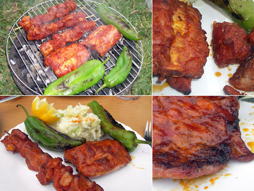 いよいよイベリコの登場だ。まずは串焼きとスペアリブから焼こう。付け合せの野菜はイタリアピーマン。串焼きは赤身の肉でやや固めなのだが小さく切ってあるので食べやすい。スペアリブは肉が薄いので、より香ばしい味わい。そして最後に脂が筋に入ったハラミは予想通りにジュワーッと脂の旨味が口に溶け出す肉だった。イベリコはどんぐりで育つそうだが、赤身より脂身にナッツのコクが出るからスペアリブやハラミが特徴的で美味だった。
