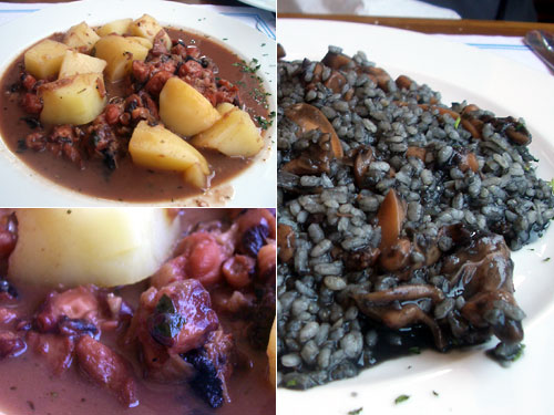 クロアチアに入ってからテレビ番組で料理を見てきたが「タコの赤ワイン煮」はかなりポピュラーだった。魚介類なのに赤ワイン煮?ととても興味があったので私はそれを注文。懸念していた生臭さはなく、柔らかくなったタコの旨味だけが楽しめるのだった。残念なのは量を間違えたかとても塩辛かった事。リゾットは墨が豊富に香り高く入っていてお値打ちだった。ソースが絶品。当たりだ。