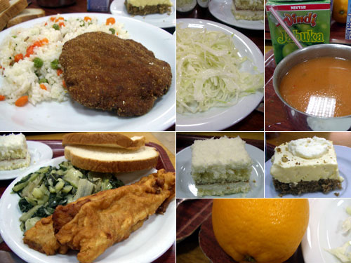 今日のメインはお肉がメンチカツとピラフ、魚はフライと茹でた青菜だった。これにオリーブオイルとお酢でマリネしたキャベツサラダ、トマトベースの野菜スープ、ジュースかヨーグルト、ケーキ2種から1つ、オレンジもついてくる。ご覧の通りクオリティーは学食なのでそれなりだがボリュームは体の大きなクロアチア人に合わせてかビッグサイズだし野菜も適当にとれてこの値段は嬉しい。オレンジは明日の朝ごはんにまわせたし、良かった!