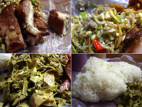 献立:豚炭火焼、惣菜、カオニャオ、ビール、デザート