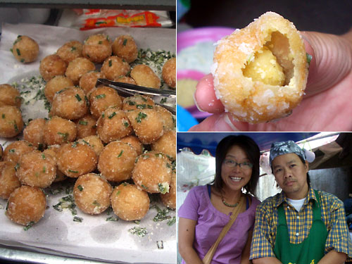 どーも納得のいかない昼食だったので口直しのデザートを探していたらかなりペラペラの東北っぽいなまりの日本語が話せる男性の屋台で揚げた団子に砂糖と葱をまぶした物に出会った。外側はもち米で作ったお団子で、中に薄黄色い薄甘い餡が入っていて1つTHB2=6円。4つお願いしたら同料金で6つくれた。カリッとしてもちっとしてそんなに甘くなくて旨い、旨い。あっという間に全て胃袋におさまってしまった。これはラオスじゃなかったね。