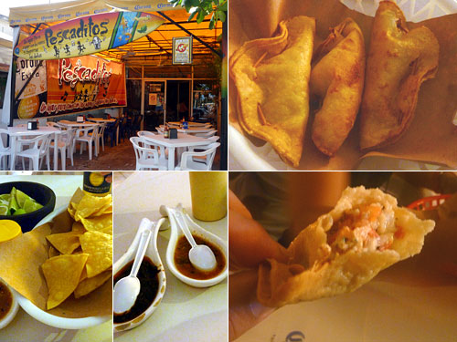 ヤシャチラン通りにサーフボードが目印のおいしいシーフードレストランがある。お目当ては魚の具をトルティーヤに包んで揚げたものだ。3つで35ペソ(245円)は一見少ないように見えるが、トウモロコシの生地のせいか結構満腹になる。両端を楊枝で留めただけなのに中はジューシーで熱々なツユがあふれ玉ねぎの甘みと相まって魚もふっくらした味わい。昼なのでコーラと食べたが、やっぱりビールやマルゲリータが似合うんじゃないかな。