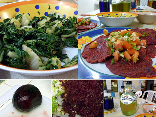 ビーツはここメキシコではベタベルという名称で安くてポピュラーな野菜として売っている。皮をむいても中が鮮やかなワインレッドのこの野菜をすりおろしてネギと卵と小麦粉と塩・コショウを混ぜてうす焼きしてみた。生の時にする薬のような味は焼くと控えめになりうっすら甘い味のするふわふわ揚げ。色がきれいなので面白い一品になった。トマトとパセリと玉ねぎのソースを添えて。