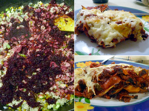 真っ赤なビーツ、スペイン語名ベタベルを使ってラザニアを作ろうとした。玉ねぎ、人参、ズッキーニ、ベタベルをすったもの、トマト、ひき肉を炒めてミートソースにし、ラザニアとソースを重ねてオーブン焼きしたのだが、ベタベルを入れるからとトマトを少なくしたために水分不足になってしまった。またベシャメルソースをなくしたので味がしつこい。ふーむ。色々と改善点を残したラザニアになった。色と味はまずくないので次回に期待しよう。