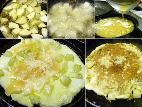 メキシコでトルティーヤはトウモロコシの粉のクレープだがスペインではじゃがいもをのオムレツを指す。マドリッドで知った本場の方法でトルティーヤを作った。常温の油と3cm角に切ったじゃがいもをフライパンに入れて中火を点火。じゃがいもが柔らかくなったら溶き卵を投入。冷たい卵が一度下に沈んでじゃがいもを包み込むように浮上して火が通ったら余分な油を捨て、別のフライパンに裏返して焼き目をつける。