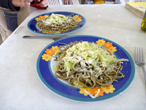 同宿の作家岡崎さんと食べ物の話になった時にフランス人シェフから聞いたというレシピを教えてもらった。調べるとかの「パスタ宝典」に北イタリアのピッツォッケリというのがあるようだ。そば色のパスタがあったので茹であがる2分前に千切りチリメンキャベツを入れて、熱くしたフライパンににんにくとバターを溶かして麺とキャベツを入れチーズをかけた。まずくないが本物じゃない。ちゃんとした物を食べてみたくなった。