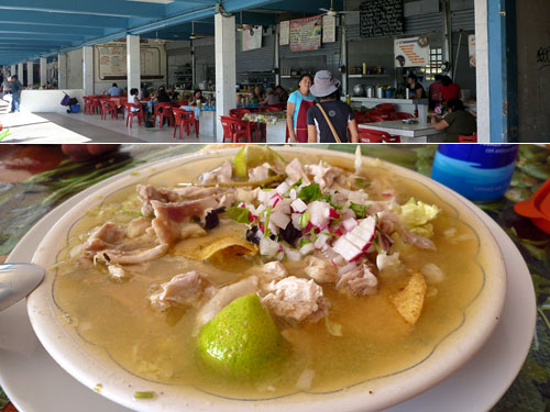 メリダの市場併設にずらりと並んだ食堂。どの店も掲げている料理がソパ・デ・リマとレジェーノ・ネグロだったので早速注文。ソパ・デ・リマはたっぷりの鶏肉を使った澄んだスープにこれ又たっぷりライムを入れて玉ねぎとパクチーのみじん切りをかけて食べる。肉の量が多くこれだけで立派な食事として成立する一品だ。ここのトルティーヤはカンクンよりもトウモロコシ含有率が高いのかより黄色く素朴な味だった。