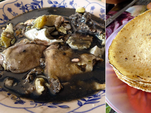 もうひとつのレジェーノ・ネグロはレジェーノ(詰める)・ネグロ(黒)ということでソーセージのような物を連想させるが、実は七面鳥のドラムと茹で卵とミンチボールの黒いソース煮込み。店の説明によるとチリを焦がして黒くしたソースだそうで味噌のように市場でソースだけ売られている。少しピリッとっするやや酸味のあるソースだった。色が何ともエキゾチックだが味は優しくかなりボリュームのある一品だった。