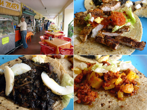 メリダの市場でタコス。ユカタンはトルティーヤを揚げてフリホーレスを塗って野菜や肉を乗せたパヌーチョスという料理が名物だそうだがどうにも油っこい感じなので敬遠した。タコスはユカタン名物レジェーノ・ネグロを具にしてみる。真黒なソースにチキンをほぐした具が入っているがピリッとするくらいであまりインパクトはない味。他は焼き肉タコスとチョリソーとポテトのタコス。チョリソーはピリッと酸味のあるソーセージで定番の具の1つだ。