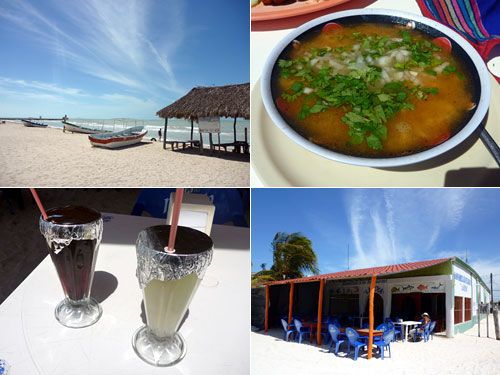 フラミンゴが生息するセレストゥン自然保護区を見学していい感じに空腹。帰りに村によってご飯を食べることにした。メキシコ湾を目の前にして立ち並ぶシーフードレストランからバイクタクシー運転手のなじみの店を紹介してもらう。虫が多いせいかジュースは口をアルミでふさぐという気使いが嬉しい店だった。魚介のスープは近海海老がたっぷりで予想通りのおいしさ。さてもう一品は?