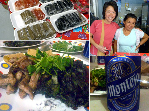 メリダの市場でよく目にするオレンジ色、緑色、黒の3種の粘土のような板。これはユカタン州特有の調味料でそれぞれ、アチョテ、ビステック、ネグロと呼ばれている。ビステックは焼き肉、ネグロは黒の意味で調味料としての名前とは思えない。緑はオレガノベース?、黒は焦がし唐辛子だそうでピリッとする。チンジャオロース風にして食べてみた。緑が旨い。ビールの名モンテホはスペイン征服者の名前。
